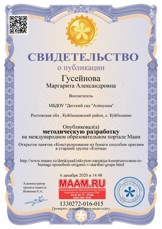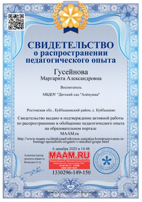 Педагогическое кредо: Быть педагогом - непросто. С одной стороны - это огромная ответственность. С другой - полный драйв! Любить всем сердцем детский смех, детскую речь, непосредственность, Чувствовать в себе море творческого потенциала - Это для меня удовольствие! Педагог с моей точки зрения это созидатель, творец. Только ему открыто главное сокровище - детские сердца, Которые ждут тепла, доброго слова, новых знаний И готовы всегда отвечать взаимностью.