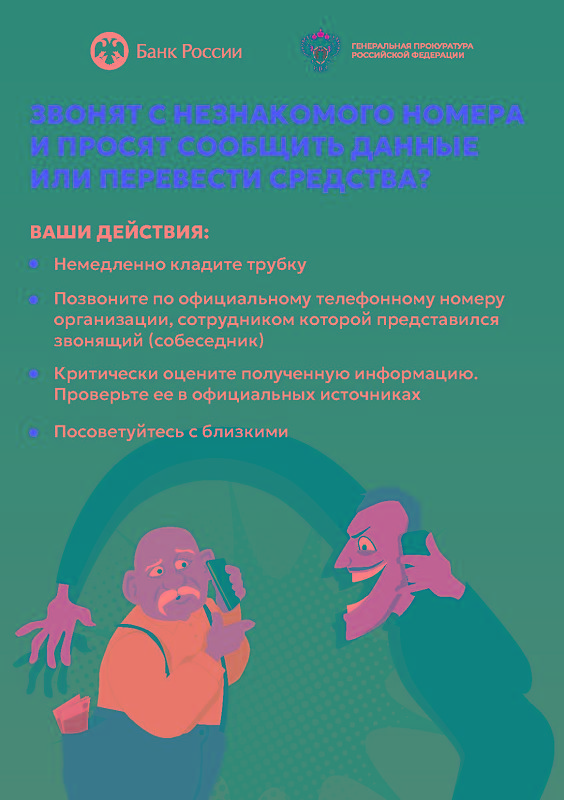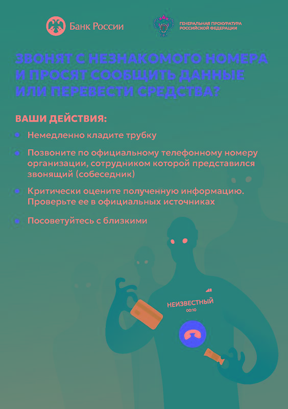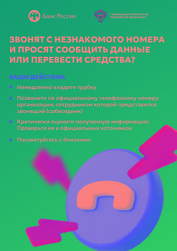Никогда и никому не сообщайте свои личные данные, пароли и реквизиты банковских карт по телефону! Если вам предлагают перевести ваши деньги на «безопасный счет», знайте — это уловка! Прекратите разговор немедленно! Ваши деньги уже находятся в безопасности на вашем счете.