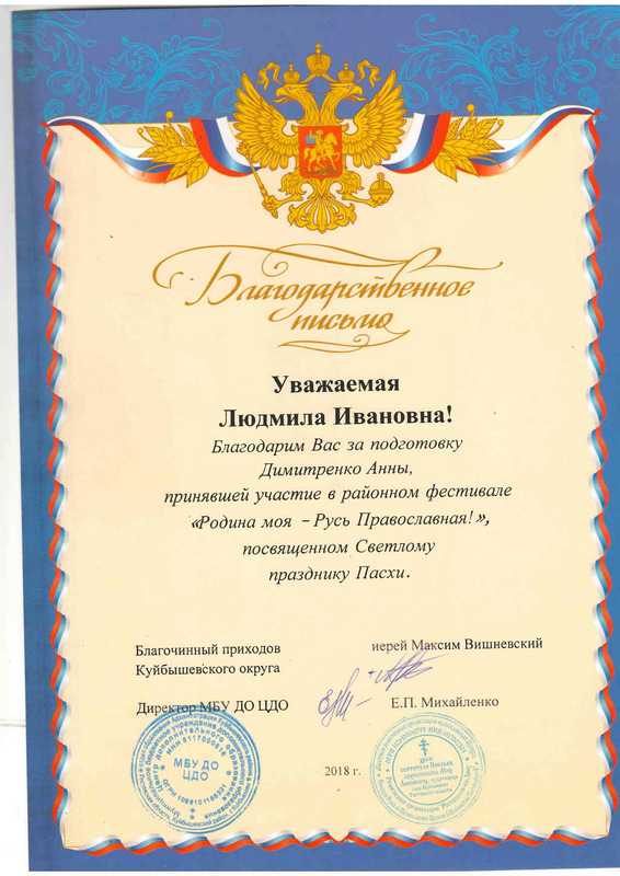 18.04.2018 г. в МБУ ДО ЦДО с. Куйбышево состоялся районный фестиваль "Родина моя - Русь Православная". Воспитанники детского сада под руководством музыкального руководителя Тилищак Людмилы Ивановны приняли участие в фестивале посвященному Светлому празднику Пасхи.