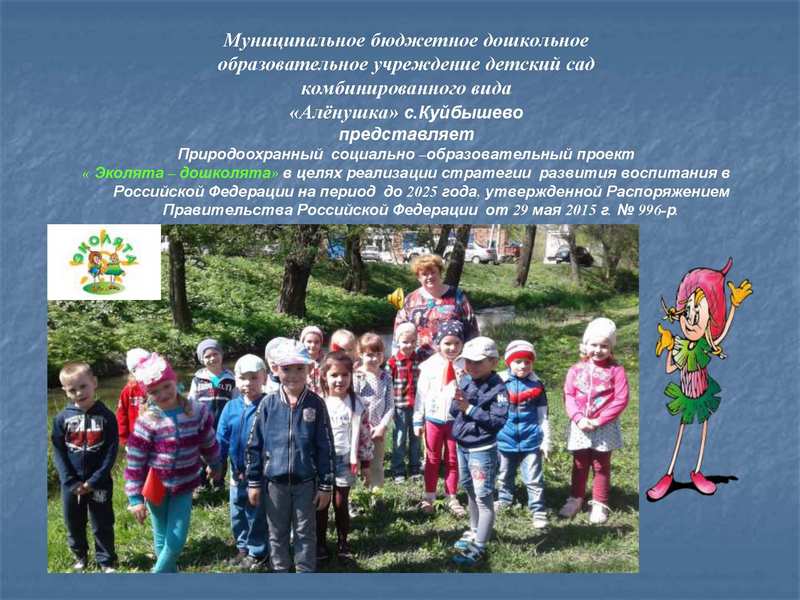 МБДОУ "Алёнушка" принял участие в Природоохранном  социально –образовательном проекте «Эколята – дошколята» в целях реализации стратегии  развития воспитания в Российской Федерации на период  до 2025 года, утвержденной Распоряжением Правительства Российской Федерации  от 29 мая 2015 г. № 996-р.