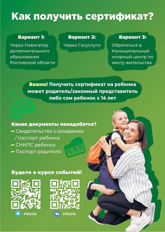 С 1 сентября 2023 года осуществляется выдача социальных сертификатов дополнительного образования. Получить сертификат можно через порталы «Навигатор дополнительного образования Ростовской области» и «Госуслуги».